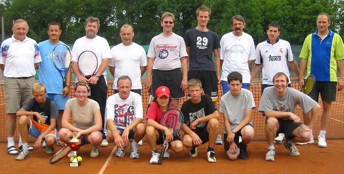 Der Hobbymeister 2005 heißt Mario Hutsch. Unter 15 Teilnehmern setzte sich der Rothenburger (stehend, ganz rechts) im Endspiel mit 6:3 gegen Daniel Schuster (stehend, Vierter von rechts) durch. Titelverteidiger Markus Fläschner war dieses Mal nicht am Start. Den dritten Platz sicherte sich Heinz Maier vor Kai Schörner, Klaus Jerger und Ottmar Oeder. Beim Turnier waren alle Aktiven wieder mit viel Begeisterung dabei. Einige Teilnehmer zeigten Interesse an einer Mitgliedschaft in der SG-Tennisabteilung. Startberechtigt beim Hobbyturnier sind nur Jugendliche und Erwachsene, die kein Mitglied einer Tennis-Vereinsmannschaft sind.