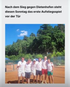 Am morgigen Sonntag, 6. Juli, haben die ersten Herren die erste große Chance, den erstmaligen Aufstieg in die Landesliga 2 perfekt zu machen. Der ungeschlagene und souveräne Tabellenführer trifft ab 10 Uhr auf den TSV Rohr II. Zuschauer sind herzlich eingeladen.